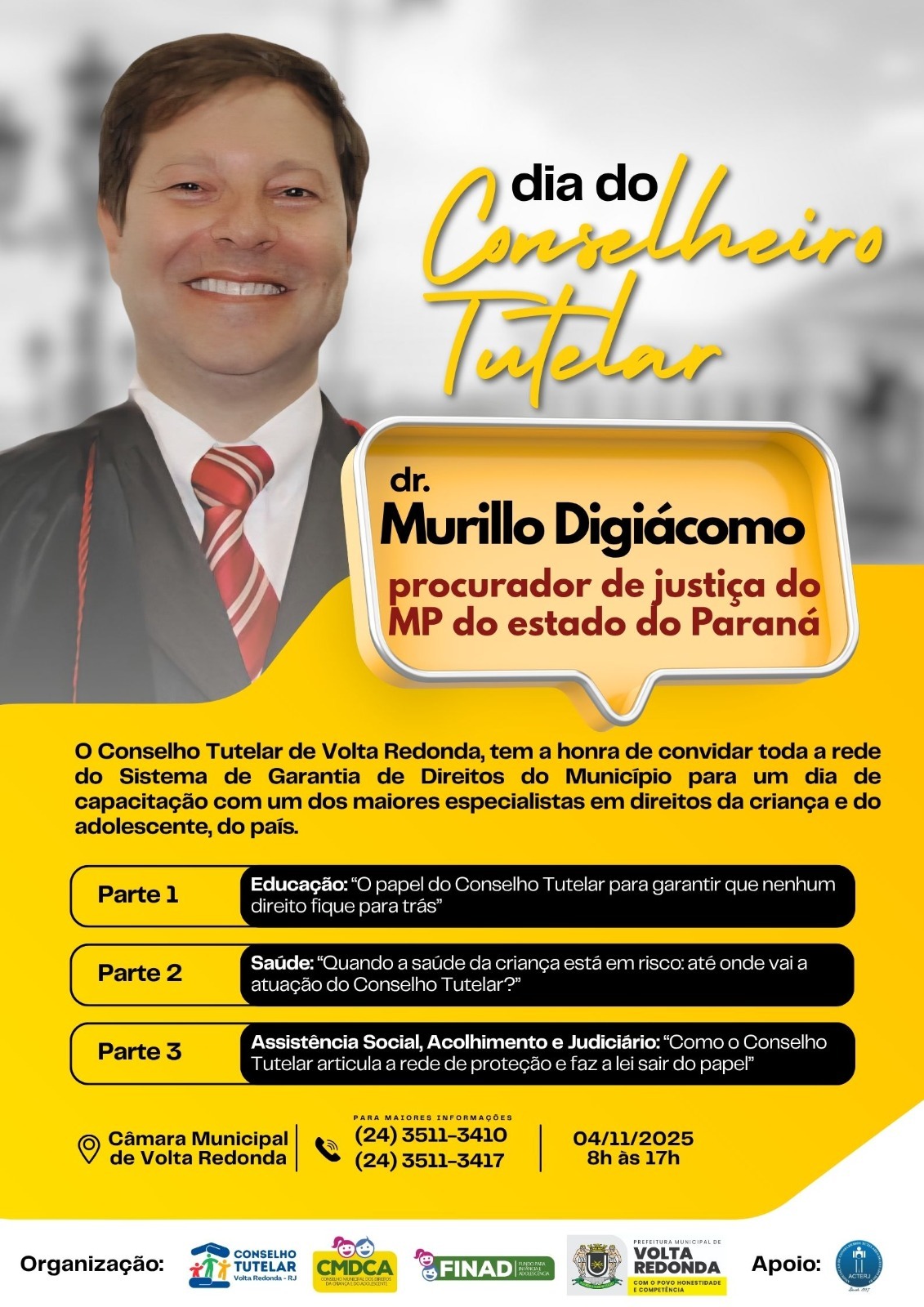 Em comemoração ao Dia do Conselheiro Tutelar, celebrado oficialmente em 18 de novembro, Volta Redonda vai antecipar as celebrações com um evento especial nesta terça-feira (4), das 8h às 17h, na Câmara Municipal. A atividade contará com uma palestra do procurador de Justiça do Ministério Público do Paraná, Murillo Digiácomo, um dos maiores especialistas em direitos da criança e do adolescente do país.