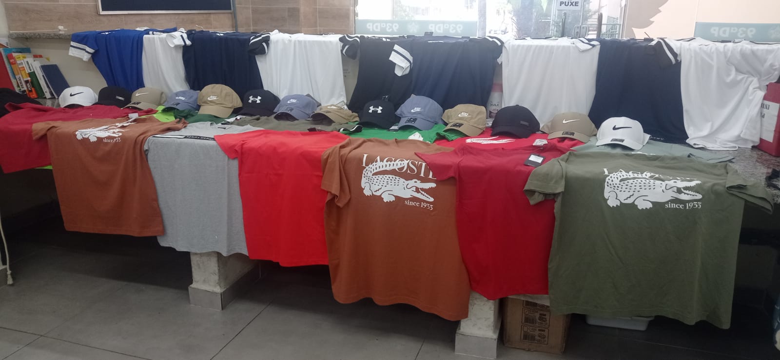 Dentro do carro, os agentes encontraram diversos produtos de marcas conhecidas, entre eles 10 bonés da Nike, dois da Adidas e dois da Under Armour, além de 22 camisas de marcas como Adidas, Lacoste, Aramis e Tommy Hilfiger, mercadorias avaliadas em aproximadamente R$ 8 mil.